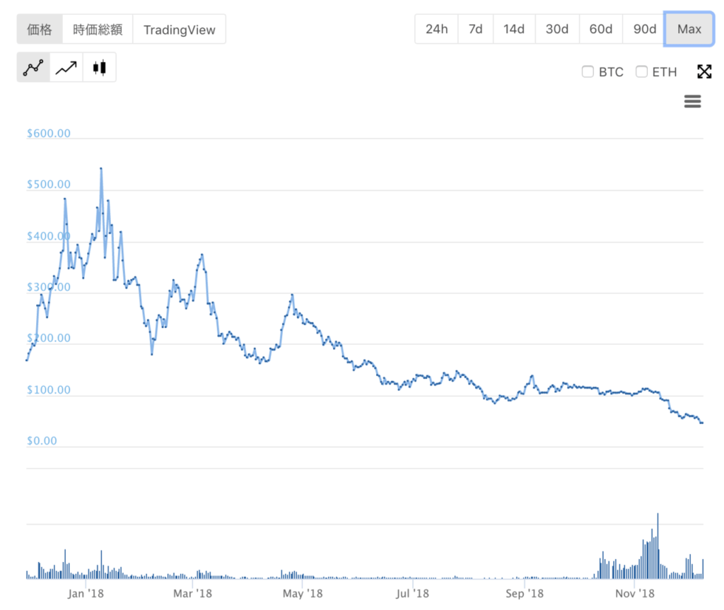 2018年1月に最高値の$550円(約62150円※)を記録したあとは、徐々に価格が下がり、2018年12月には約$45(約5085円)となっています。仮想通貨全体の相場が下がっているのと同じく、ピーク時の約1/10程度に落ちていますね。